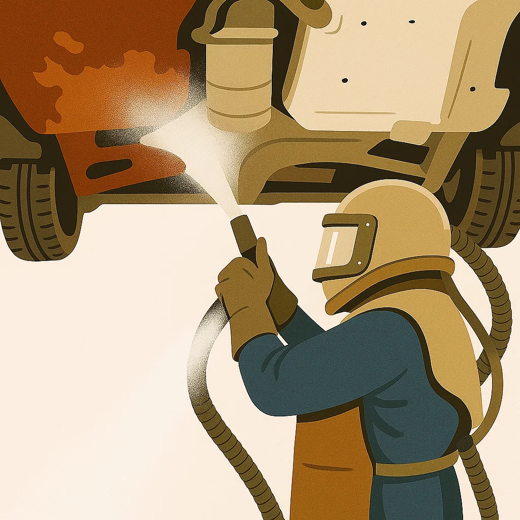 Limpieza profesional con chorro de arena a alta presión, eliminando el 100% del óxido, grasa y pintura deteriorada de tu chasis.